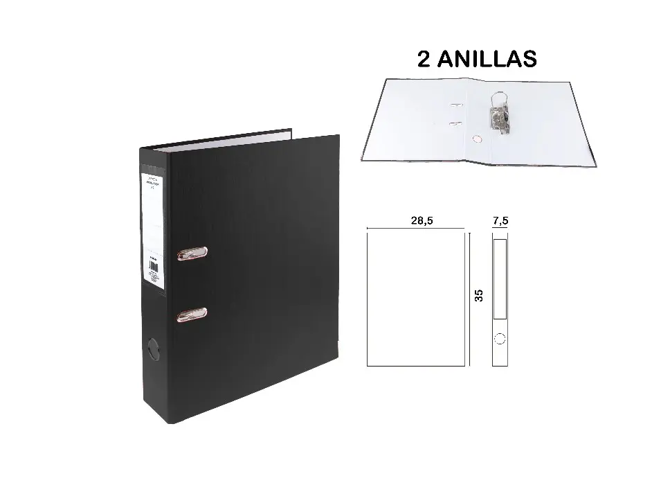 Carpeta de 2 anillas fabricadas en cartón forrado. Lomo de 75 mm, anillas de 40 mm. Orificio para acceso fácil a la carpeta. Con lomera y etiqueta para identificación de los documentos. Para documentos A4. Medidas de la carpeta: 285 × 350 mm. Color negro.