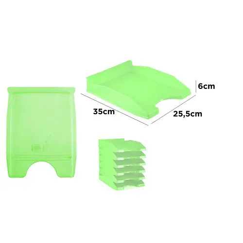 Bandeja de sobremesa apilable. Fabricada en plástico muy resistente. Con hueco para tener a mano en el escritorio los documentos ordenados y poder clasificarlos por color. En el frontal de la bandeja se incluyen dos espacios para etiquetar con los asuntos que alberga cad una. Para documentos A4. Medidas: 260 × 350 mm. Color verde manzana.