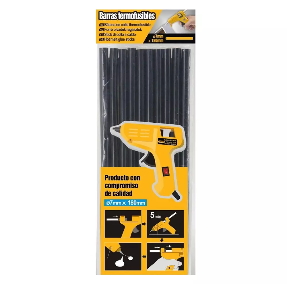 Barras de silicona caliente o barra termofusible, en color negro. Aplicable con pistola de silicona. Contiene 10 barras.