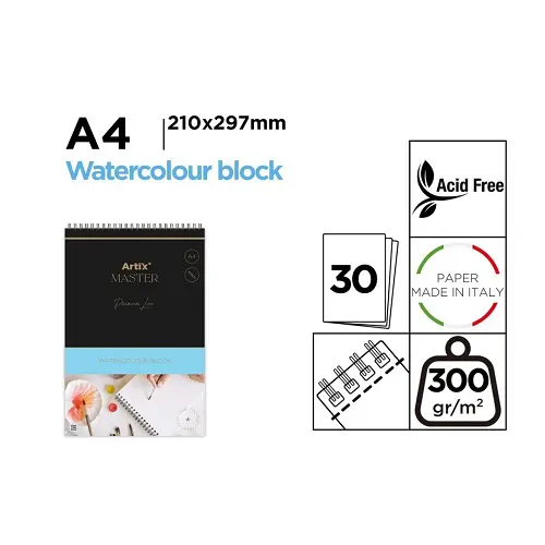 Block de acuarela fabricado en papel de 300 g/m2. Línea Premium. Encolado y con microperforado para cortar fácilmente las hojas. Papel muy blanco de excelente calidad y de color natural libre de ácidos. Gran espesor que lo hace ideal para técnicas húmedas: los colores hay que diluirlos con agua como la témpera o las acuarelas. El papel no se comba ni hace virutas. Bloc de 30 hojas. Tamaño A4. Medidas: 210 x 297 mm