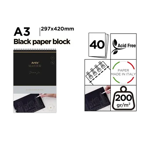Block de dibujo fabricado en papel negro de 200 g/m2 de gran intesidad. Línea Premium. Encolado y con microperforado para cortar fácilmente las hojas. Papel negro de excelente calidad y de grano fino libre de ácidos. El papel negro es perfecto para dibujar o pintar solo las luces, y no las sombras como se hace sobre papel blanco, anadiendo color en los reflejos y partes claras. Ideal para dibujar con lápices blancos o de color pastel, tizas, rotuladores metalizados… que hacen resaltarlas luces. Perfecto para montajes. Bloc de 40 hojas. Tamano A3. Medidas: 297 x 420 mm