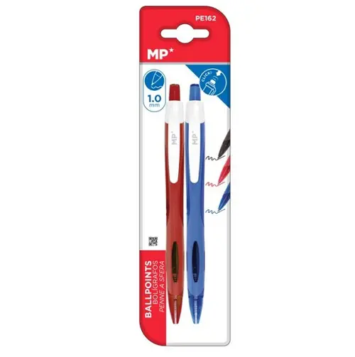 Bolígrafo retráctil con pulsador en el extremo superior (sistema click). Cuerpo de plástico transparente del color de la tinta. Con clip de sujeción en plástico blanco y grip de sujeción para un agarre más cómodo. Tinta base de aceite de gran suavidad. Punta de 1.0 mm que se desliza sobre el papel con total fluidez. Tamaño: 145 mm. Se presenta en blíster de 2 unidades surtidas: azul, rojo o negro.