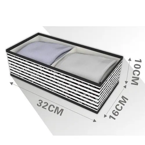 Caja rectangular de almacenamiento con una línea divisoria que crea dos compartimentos. Medidas del producto 36 x 16 x 10 cm.
