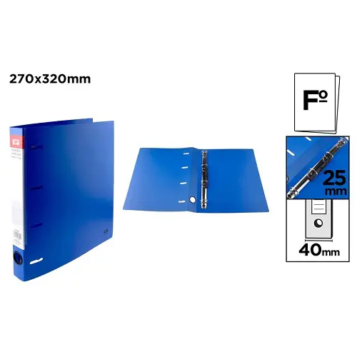 Carpeta de anillas fabricada en polipropileno opaco. Con ranuras en la portada para encajar las anillas y que quede la carpeta cerrada más compacta. Orificio en lomo para acceso fácil a la carpeta. 4 anillas de 25 mm. Lomo de 40 mm. Lleva una funda en el lomo con etiqueta para personalizar. Para documentos A4. Medidas de la carpeta: 320 x 270 mm. Colores clásicos surtidos. Blíster de 1 unidad.
