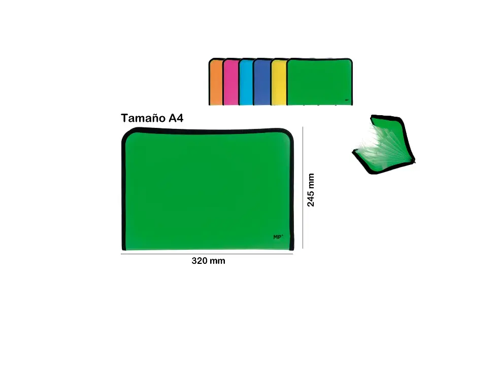 Carpeta fuelle fabricada en polipropileno opaco. Cierre por cremallera y cantos ribeteados en tela negra para mayor protección. Interior con 12 separadores en polipropileno transparente. Para documentos A4. Medidas de la carpeta: 245 × 320 mm. 6 colores vivos surtidos: amarillo, fucsia, naranja, azul claro, verde y azul oscuro.
