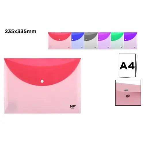Carpeta sobre fabricada en polipropileno translúcido con cierre de botón. Diverdido diseno bicolor con la solapa en colores vivos y el cuerpo en colores claros. Para documentos A4. Medidas: 330 x 250 mm. 6 colores surtidos. Blíster de 1 unidad.