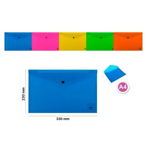Carpeta sobre fabricada en polipropileno opaco con cierre de botón. Perfecta para llevar presentaciones y tener los documentos ordenados. Para documentos A4. Medidas: 330 x 230 mm. 6 colores surtidos: rosa, naranja, amarillo, verde, azul claro y azul oscuro.
