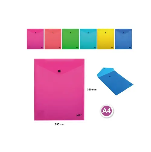 Carpeta sobre fabricada en polipropileno opaco con cierre de botón. Perfecta para llevar presentaciones y tener los documentos ordenados. Para documentos A4. Medidas: 320 x 235 mm. 6 colores fluorescentes surtidos: rosa, naranja, amarillo, verde, azul claro y azul oscuro.