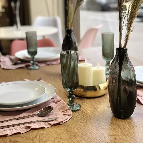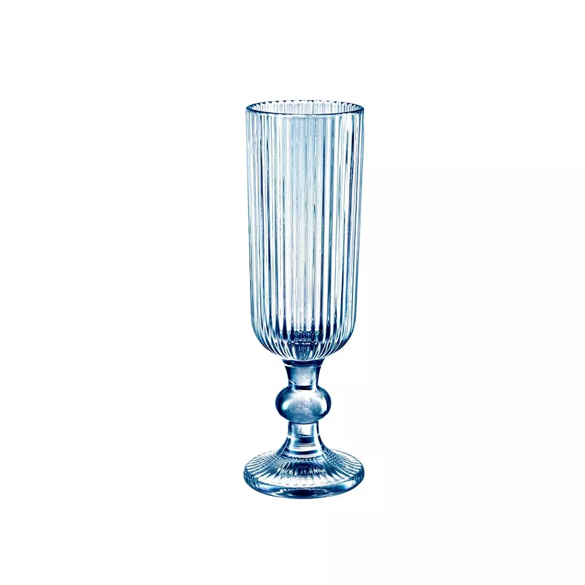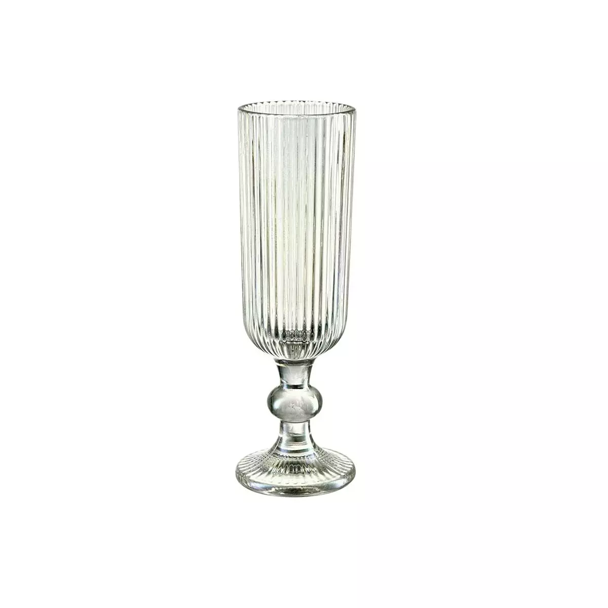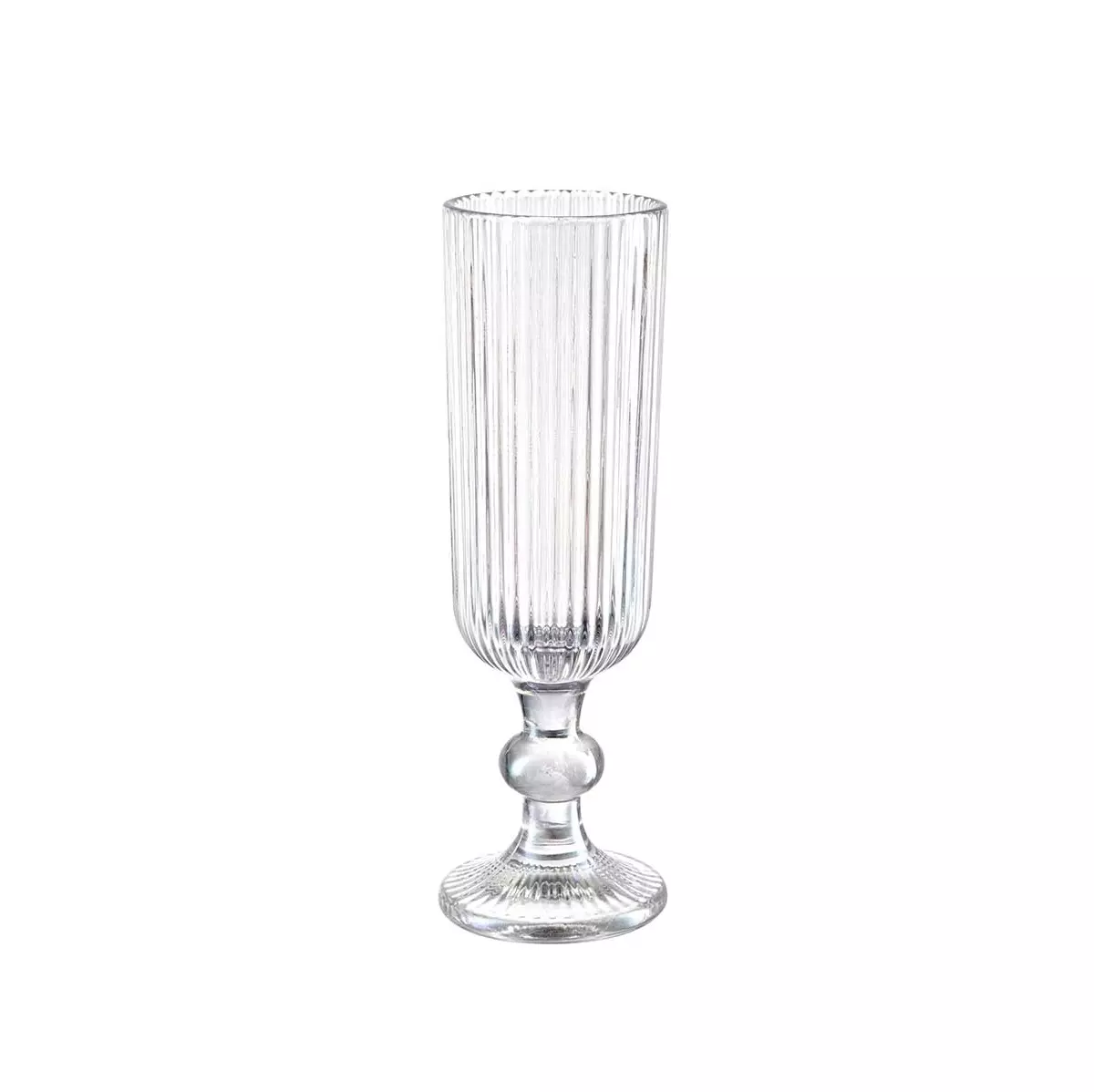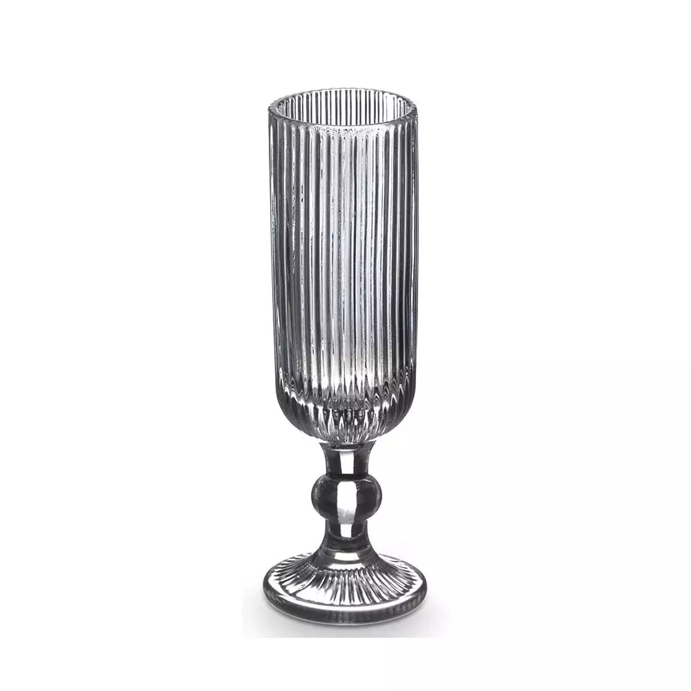 Copa champagne de material vidrio, con detalle en rayas. Temperatura: 0ºC/80ºC. No apto para lavavajillas, microondas, horno. Colores a escoger (gris, verde musgo, rosa, azul oscuro y transparente). Medida 6 x 6 x 18 cm