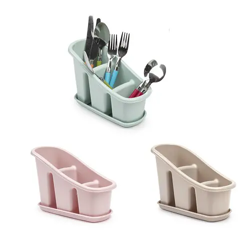 Escurrecubiertos hecho de plástico. Diseño simple, en colores surtido, al azar. Tiene 3 compartimentos y una bandeja.
