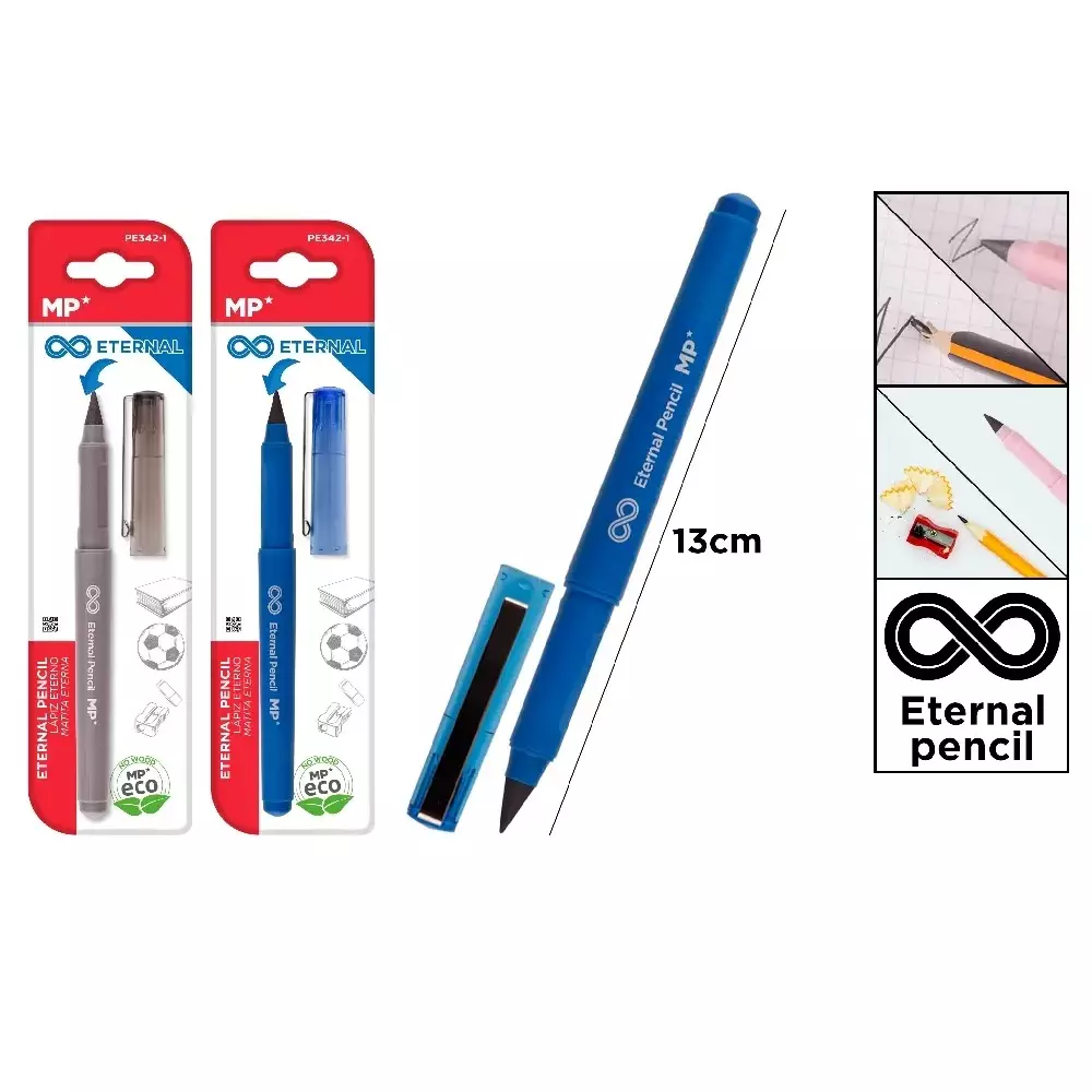 Lápiz de grafito eterno. Escritura infinita, no se acaba nunca! Cuerpo fabricado en plástico con capuchón con clip de sujeción. Se borra muy fácilmente con cualquier goma. Cuerpo gris/azul. Venta individual, color al azar.