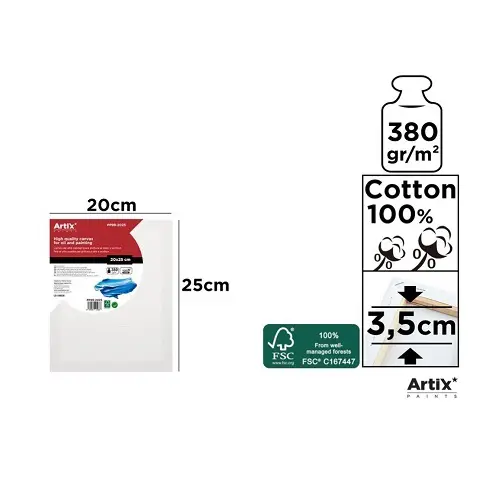Lienzo profesional de alta calidad en 380 g/m2 fabricado en tela de algodón 100% tratado con tres capas de imprimación blanca que hace que el pincel se deslice muy fácilmente y el acabado sea profesional. Tela perfectamente tensada y grapada al bastidor de madera de 3,5 cm de grosor. Incluye un juego de cunas de madera para las esquinas y tensar homogeneamente y abrir más la tela. Indicado para pintura al óleo y acrílica. Medidas: 20 x 25 cm.