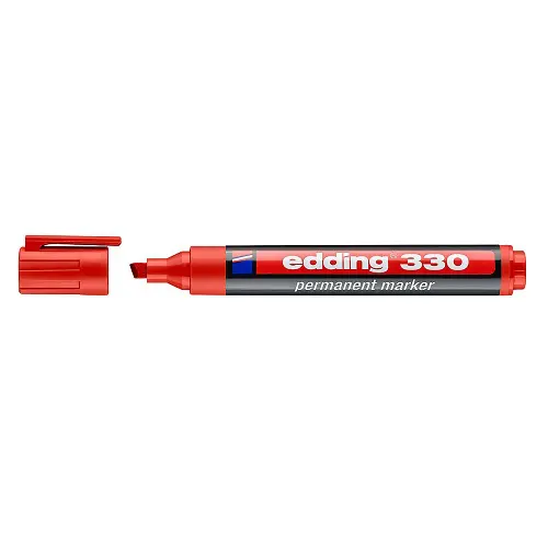 Marcador permanente edding 330 de color rojo de trazo de la punta biselada. Tiene una punta de 1 a 5 mm de grosor. Marcador permanente para marcar y etiquetar sobre casi todos los materiales. Resistencia al agua y al roce sobre casi todas las superficies. Fabricado en Alemania.