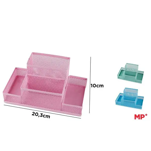 Organizador de sobremesa para tener todos los complementos de oficina a mano y ordenados. Fabricado en metal de rejilla color en colores. Muy resistente.4 huecos para poner lápices, rotuladores, tijeras, grapadoras, notas de quita y pon… Venta individual. Medidas: 200 x 100 mm.
