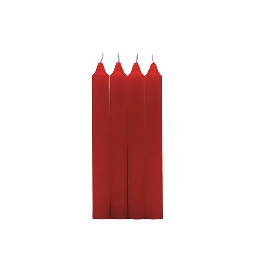 Pack de 4 velas de forma cilíndrica fabricadas 100% parafina y mecha de algodón puro sin perfume y en color rojo.