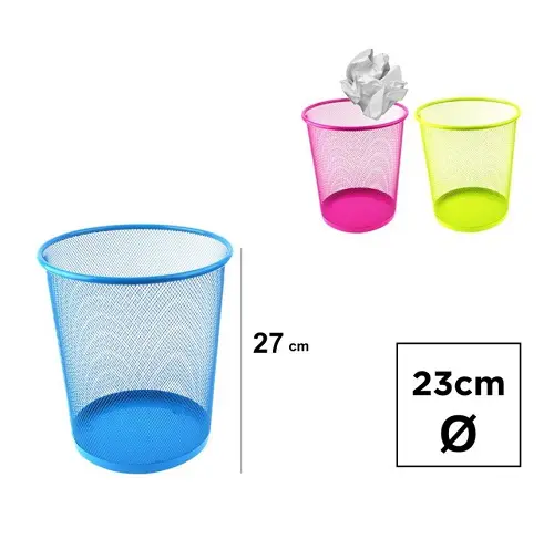 Papelera metálica fabricada en metal de rejilla pequeña. Diseño moderno y elegante que combina bien en cualquier oficina. Medidas: 230 mm de Ø y 270 mm de alto. Colores disponibles: azul, fucsia y verde.