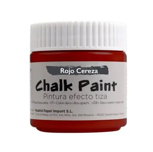 Pote de 100 ml de pintura efecto tiza de color rojo cereza. Acabado ultra mate. Altamente resistente al paso del tiempo y la humedad. Gran cubrición y adherencia a múltiples superficies. Uso en decoración, objetos, manualidades, etc. No requiere preparación de la superficie. De fácil limpieza con agua y jabón. Agitar antes de usar