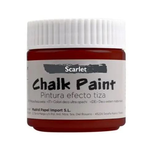 Pintura efecto tiza o Chalk Paint. Es una pintura acrílica al agua que presenta un acabado mate similar al aspecto de tiza y es perfecta para aplicar sobre muebles y objetos decorativos. Acabado empolvado muy atractivo, propio del estilo romántico, vintage o shabby chic de gran actualidad en blogs y revistas de decoración. Permite darle un aire nuevo a casi cualquier tipo de pieza de decoración o pequeno mobiliario ya que es un producto realmente versátil, desde una maceta, a una regadera metálica o incluso un tarro de cristal. Muy fácil de usar, apta tanto para uso profesional como para principiantes de las manualidades o bricolaje. Pintura al agua, no contiene ningún tipo de disolvente y no es tóxica. Bote de 100 ml. Color rojo escarlata.