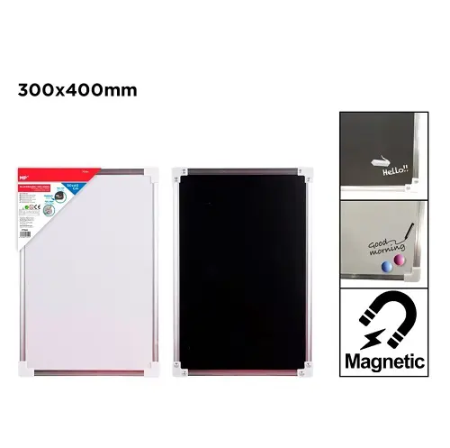Pizarra doble cara: una blanca magnética para escribir con rotuladores de pizarra blanca y otra cara negra para escribir con tizas. Marco de aluminio con esquineras para mayor protección. No incluye imanes, tizas ni rotuladores. Medidas: 30 x 40 cm.