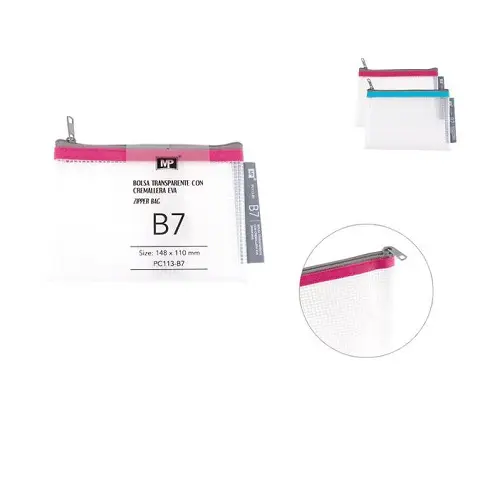 Bolsa de plástico Eva de malla con cremallera, fabricada en material ecológico. Multiusos: para documentos, lápices, bolígrafos, objetos personales… Fabricada en polipropileno transparente y cremallera de colores en azul y rosa. Tamaño A4. Medidas de la bolsa: 148 x 110 mm. Colores surtidos de cremallera: rosa o turquesa.