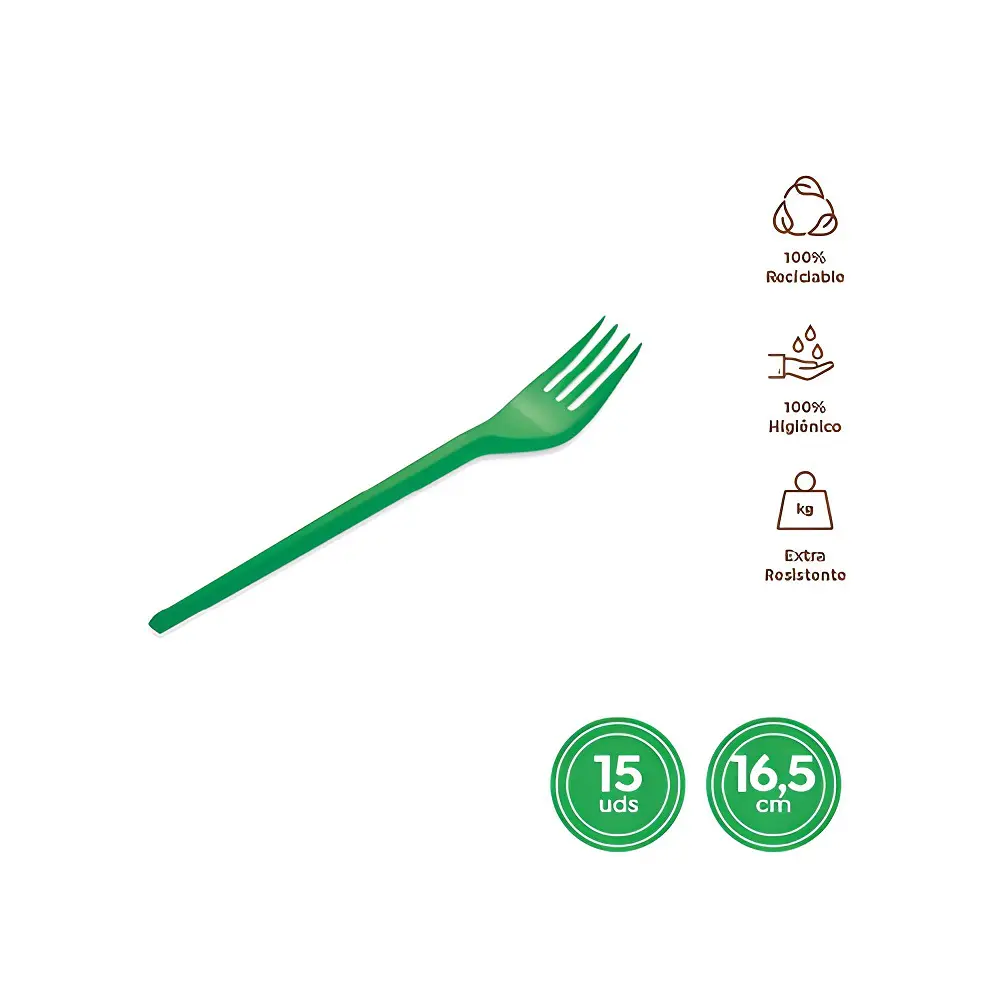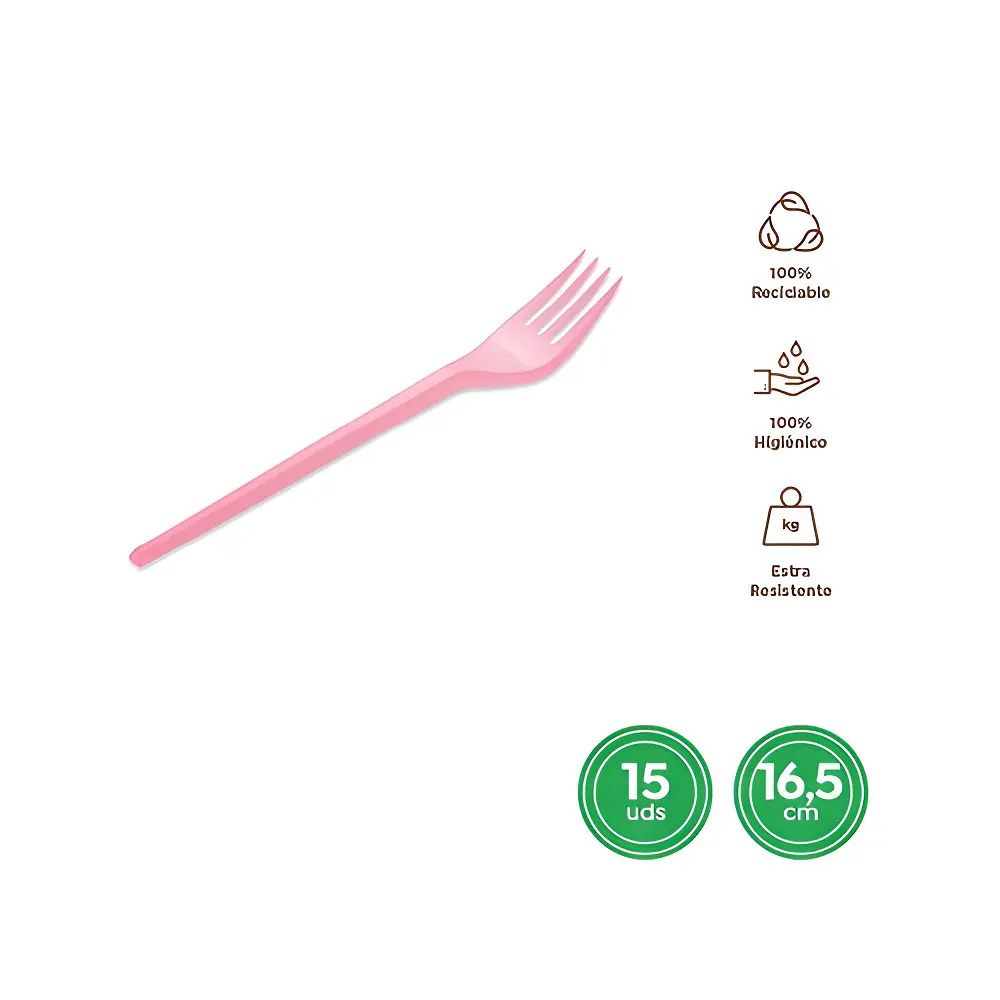 Tenedor de plástico reutilizable, paquete de 15 unidades. Colores a escoger. Medida 16,5cm.