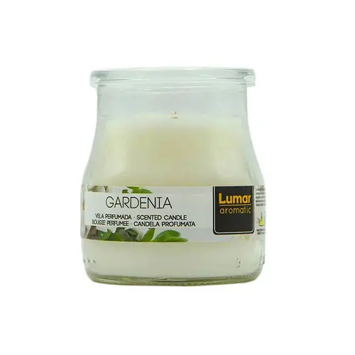 Vela de cera vegetal con fragancia a gardenia. Presentada en formato vaso yogurt de cristal 100% reciclable.